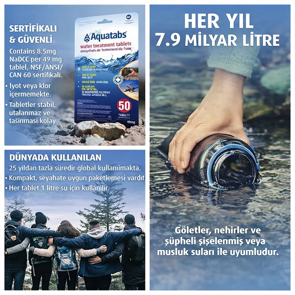 Aquatabs® dünyanın 1 numaralı su arıtma tabletidir. Bu efervesan tabletler kolera, tifo, dizanteri ve diğer su kaynaklı hastalıkları önlemek için sudaki mikroorganizmaları öldürür.