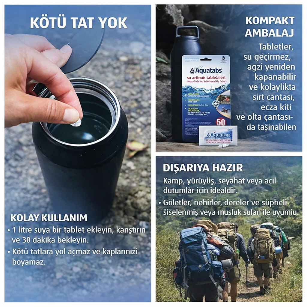 Aquatabs®, en zararlı mikroorganizmaları öldürmek için içme suyuna eklenen bir tablettir. Tablet dakikalar içinde berrak bir şekilde çözünür ve suyu 30 dakika içinde temizler.