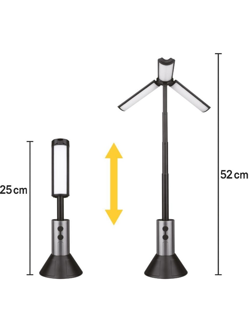 Kullanım: Çok Fonksiyonlu bu ürünü dilerseniz El Feneri, dilerseniz Kamp Lambası, Masa Lambası ve Çalışma Feneri olarak kullanabilirsiniz. Alt taraftaki düğmeye basınca 10W TG Led El Feneri, Çok Işık, Orta Seviye Işık ve Flaşör modlarında; üst taraftaki düğmeye basınca 10W 3’lü LED Gün Işığı renginde Çok Işık ve Orta Seviye Işık modlarında yanar. 26 cm’e kadar kademeli olarak uzayabilen direk sayesinde, ışığın yüksekliğini dilediğiniz gibi ayarlayabilirsiniz. 3 adet birbirinden bağımsız açılır kapanır, 360° oynar başlık sayesinde, ışığın açısını dilediğiniz gibi ayarlayabilirsiniz.
