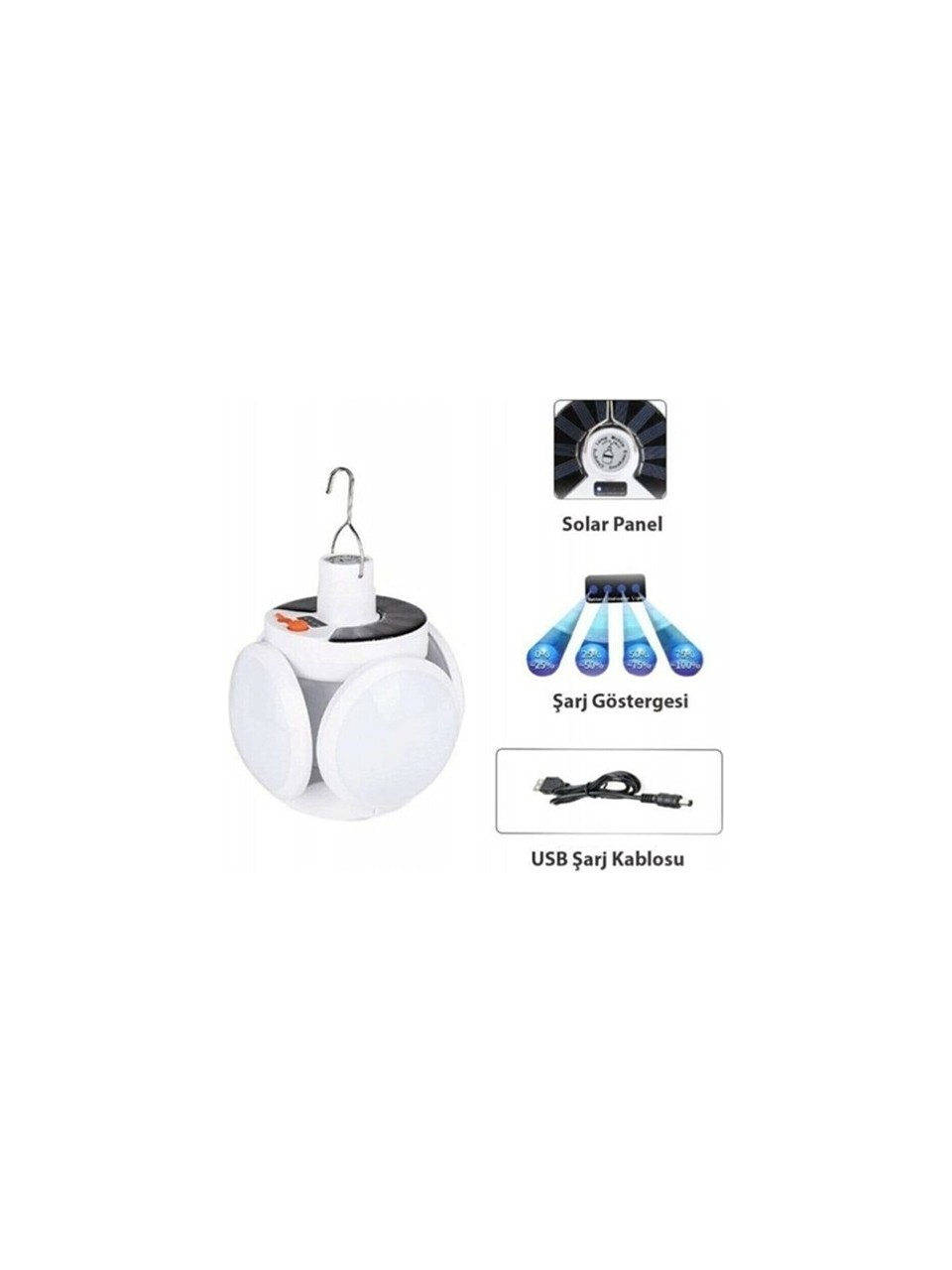 Solar Güneş Enerji Ve Usb Sarjlı 5 Kanatlı Bahçe Aydınlatma Led Askılı Pratik Kamp Lamba Solar Güneş Enerjisi ve Usb ile şarj olma özelliklerine Sahip 5 Kanatlı ve 5 farklı Işık modunda çalışan Pratik taşınabilir bir Lambadır. Ürünün üzerinde bulunan askı ile Ürünü hemen her yerde kullanabilirsiniz. Katlanabilir olma özelliğinden dolayı ışık açısını ayarlayıp daha geniş bir alanı aydınlatabilirsinz. Acil durumlarda hemen heryerde aydınlatma imkanı sunar. Ürün paketinde ki usb kablosu ile şarj ederek veya güneş enerjisi ile şarj ederek ürünü kullanabilirsiniz. Teknik Özellikler Güneş paneli: 5.5v polikristal silikon güneş paneli Pil: 18650 lityum pil 2400mAh Işık kaynağı: 45 LED Çalışma süresi: 6-8 saat Şarj süresi: Solar şarj için 8 saat /usb şarj ile 6 saat Şarj yöntemi: solar şarj (DC 3.5V) / Şarj cihazı şarjı (voltaj 4.5V) Su geçirmez: IP65 Renk sıcaklığı: 6500 Ürün Boyutu: 14cm * 11.5cm