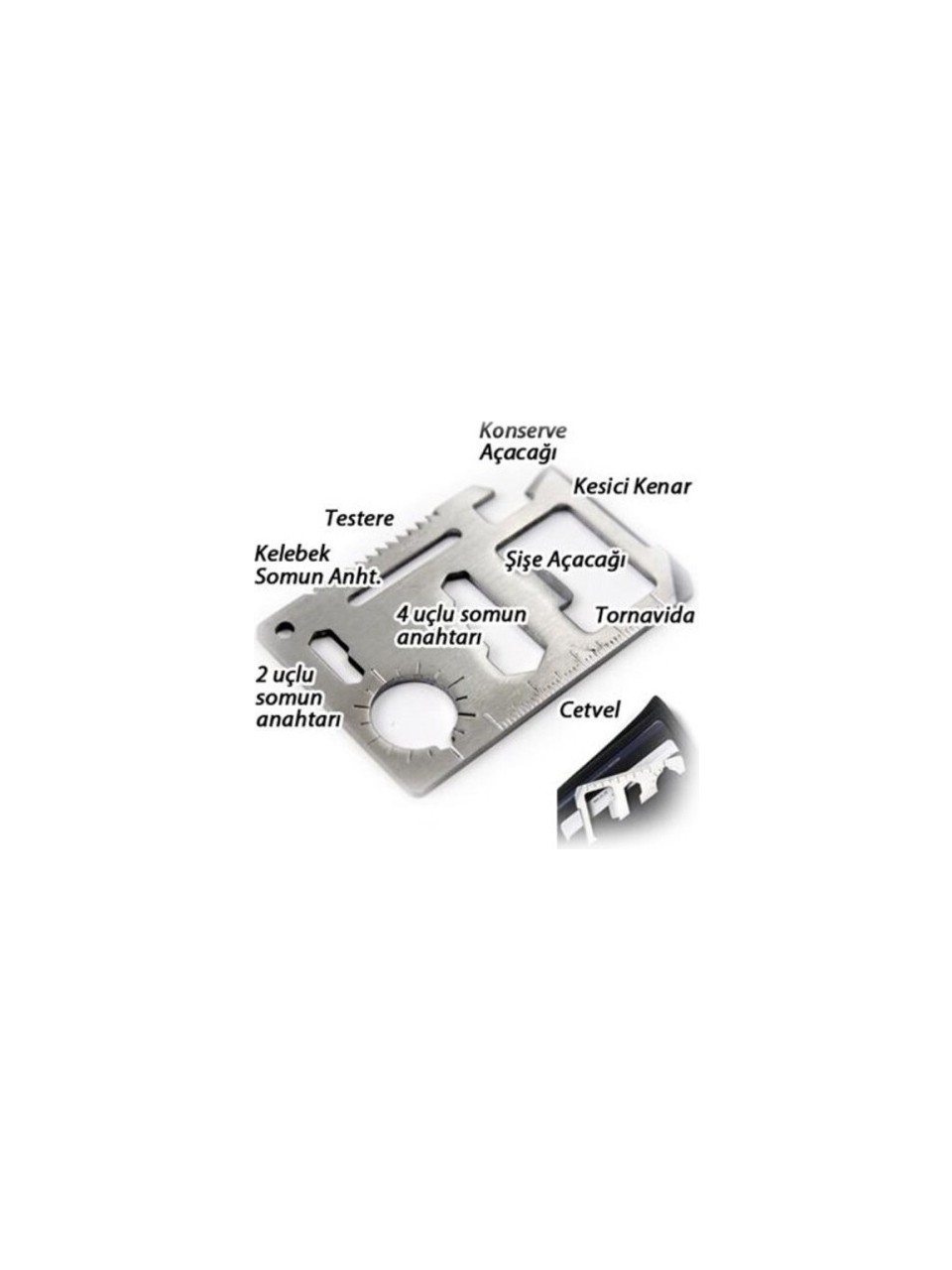 SURVIVAL ACİL DURUM KİTİ Acil Durum Survival Kiti Cüzdanınıza, Kartlığınıza Kolayca Sığar ! Acil Durum Survival Kiti Ürün Özellikleri Konserve Açacağı Testere Tornavida 4 Uçlu Somun Anahtarı 2 Uçlu Somun Anahtarı İp ve anahtarlık deliği 1 adet özel kılıfında survival acil durum kiti